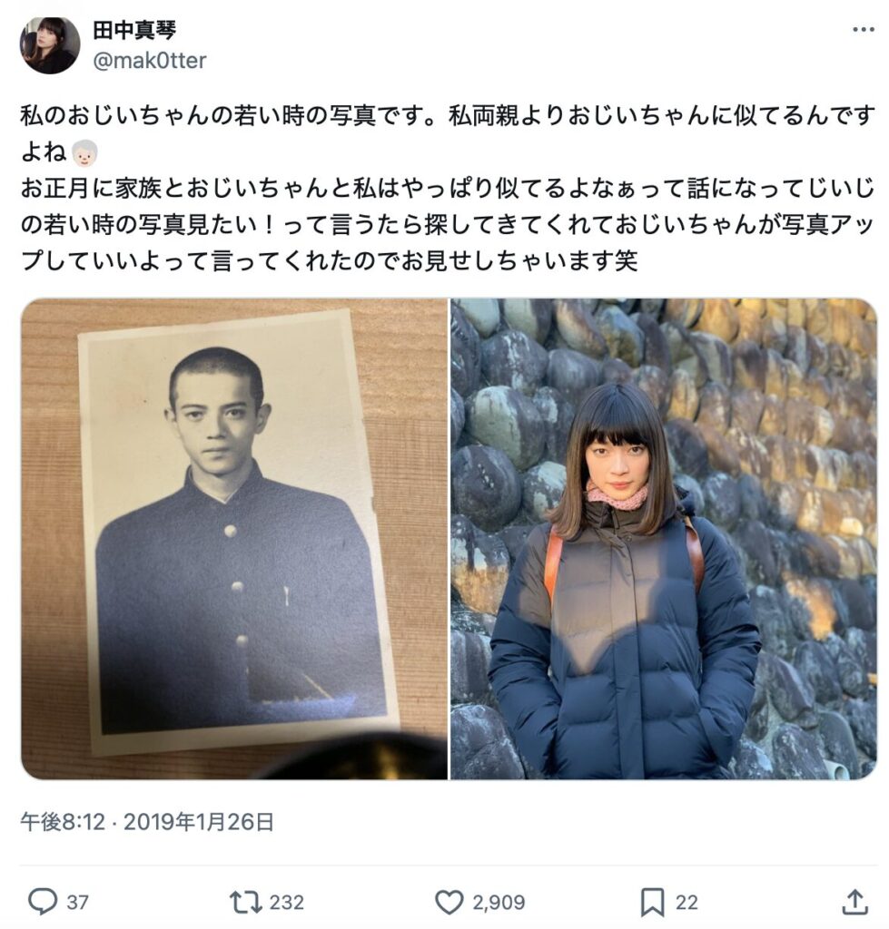 また、田中真琴は父親の方か母親の方か定かではないものの、祖父母と顔が似てるとSNSに投稿。